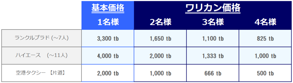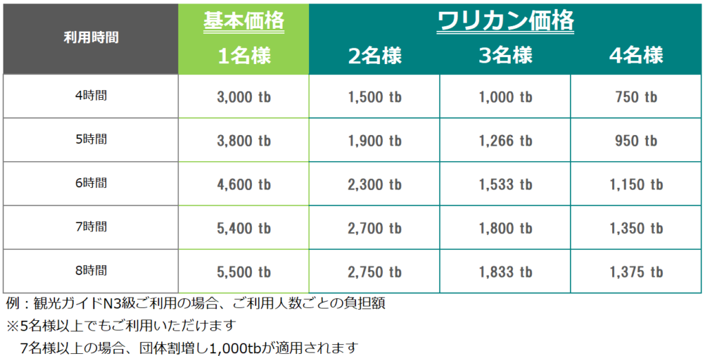| 団体割増し | 1,000 tb/日(7名以上) |